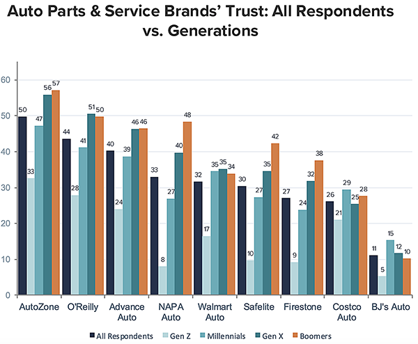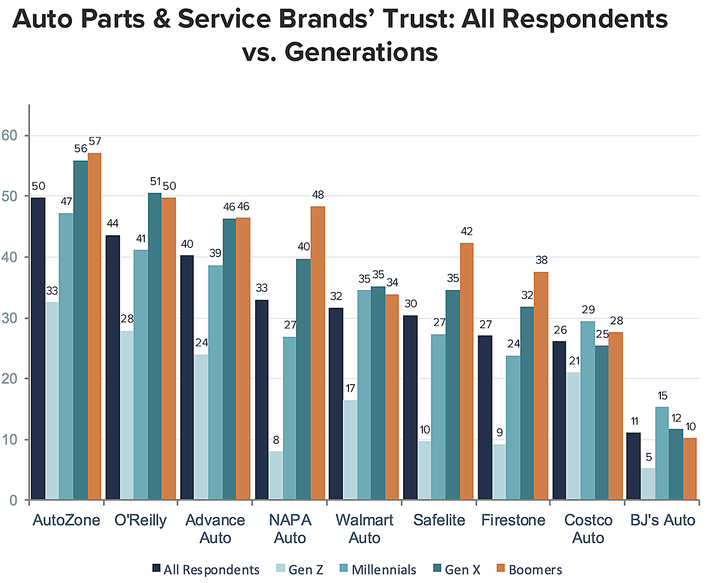 It also provides a snapshot of how they perceive brands in auto parts and service across different generations, from Gen Z (1997 –2012) to Millennials (1981 –1996) and Gen X (1965 –1980) to Boomers (1946 –1964).