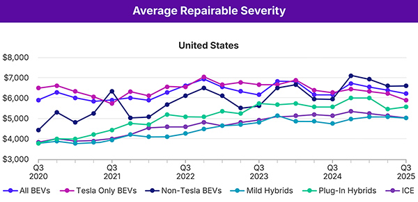 Claims Severity: Average severity for repairable BEVs dropped to $6,185 in the U.S., a decrease of 2.4% and 1.5% respectively from Q2. In both countries, automobiles with an internal combustion engine (ICE) had the lowest average severity followed by mild hybrid electric vehicles (MHEVs) and plug-in hybrid electric vehicles (PHEVs).
