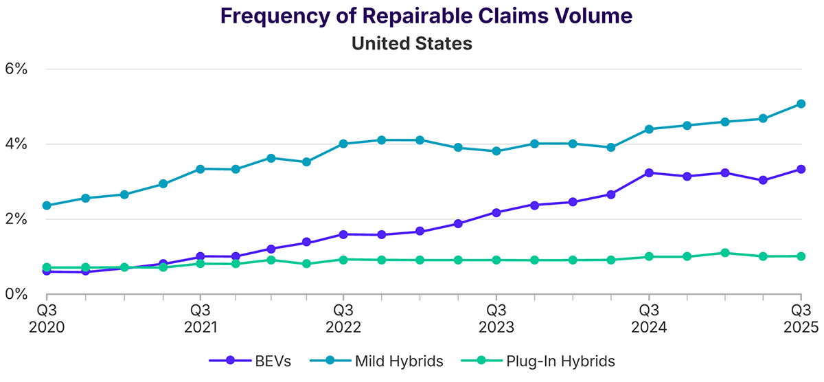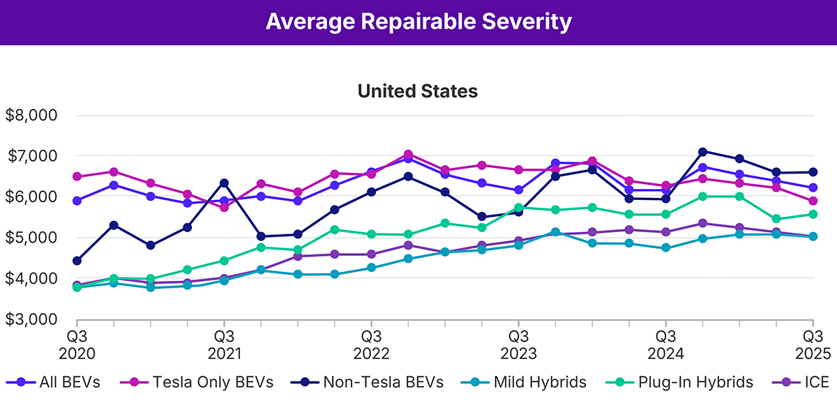 Claims Severity: Average severity for repairable BEVs dropped to $6,185 in the U.S., a decrease of 2.4% and 1.5% respectively from Q2. In both countries, automobiles with an internal combustion engine (ICE) had the lowest average severity followed by mild hybrid electric vehicles (MHEVs) and plug-in hybrid electric vehicles (PHEVs).