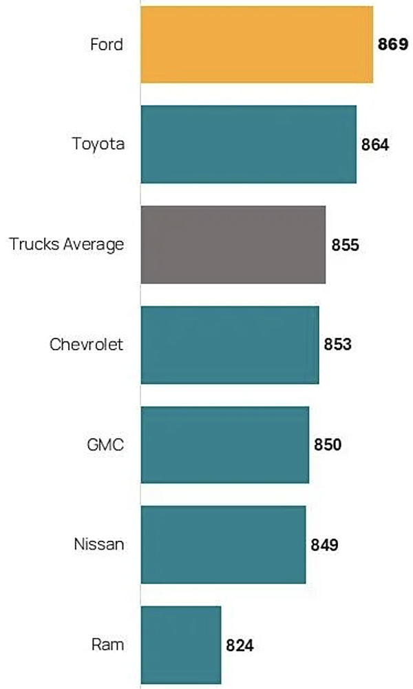 Ford ranks highest in the truck segment with a score of 869. Toyota (864) ranks second and Chevrolet (853) third.