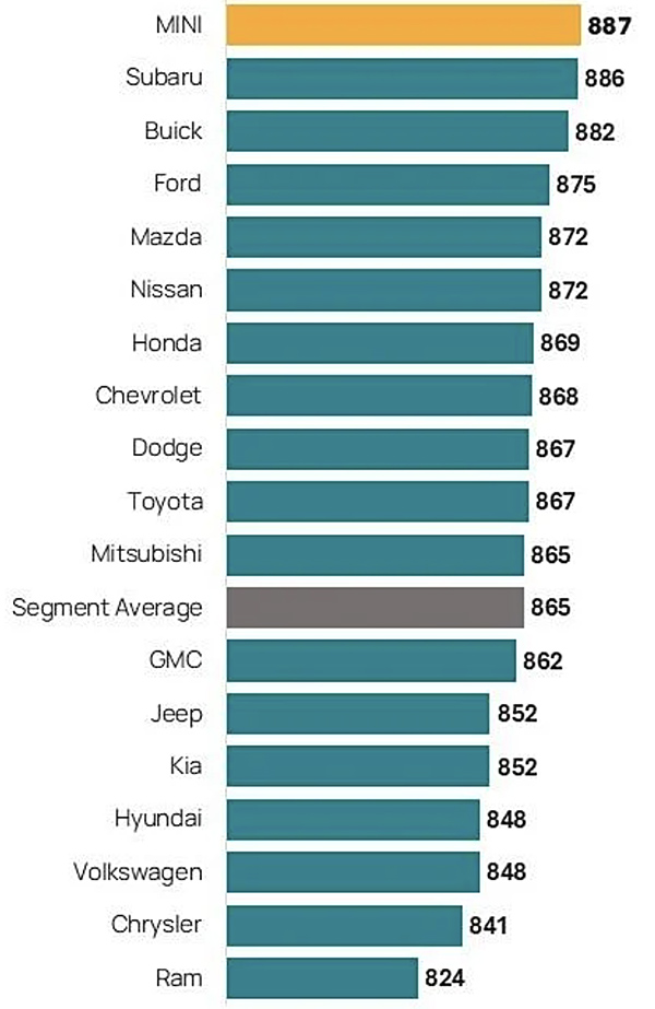 MINI ranks highest in satisfaction with dealer service among mass market brands with a score of 887. Subaru (886) ranks second and Buick (882) ranks third.