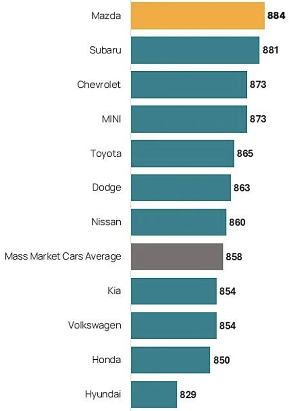 Mazda (884) ranks highest in the mass market car segment, followed by Subaru (881) and Chevrolet (873).
