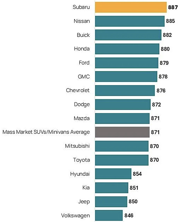 Subaru ranks highest among mass market SUVs/minivans with a score of 887. Nissan (885) ranks second and Buick (882) ranks third.
