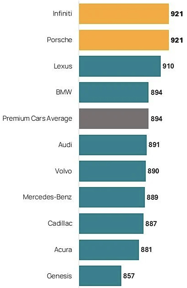 Infiniti and Porsche tie for highest in the premium car segment, each with a score of 921, followed by Lexus (910).