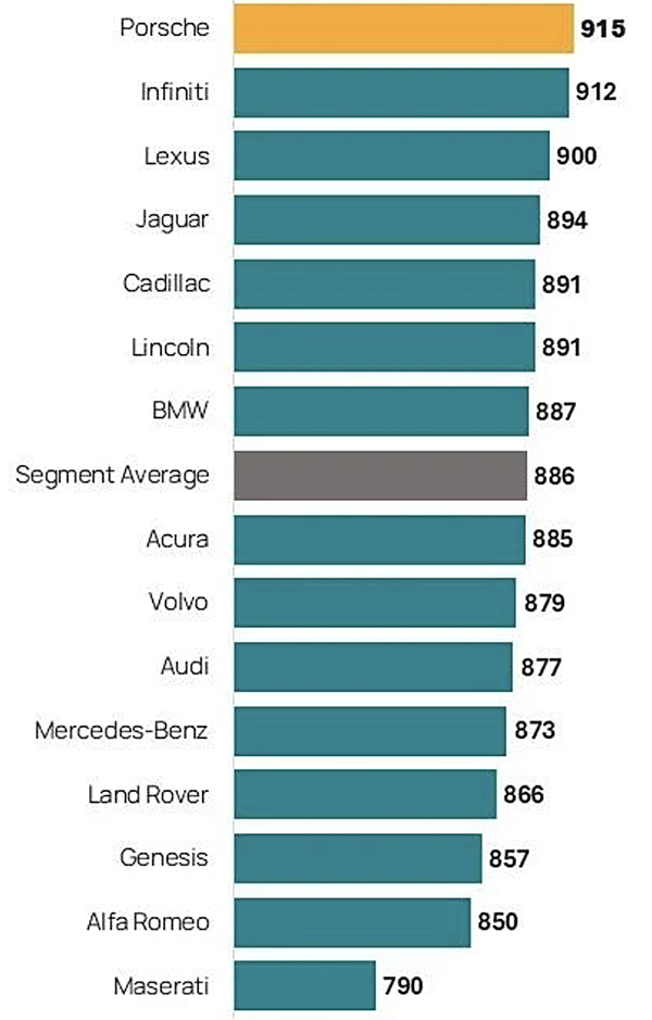Porsche ranks highest in satisfaction with dealer service among premium brands for a second consecutive year, with a score of 915. Infiniti (912) ranks second and Lexus (900) ranks third.
