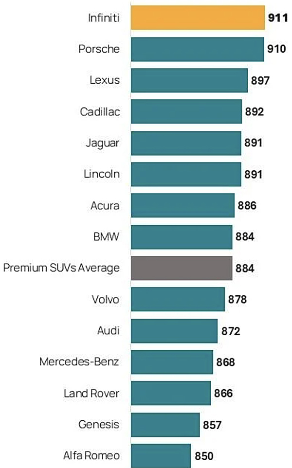 Infiniti ranks highest in the premium SUV segment with a score of 911. Porsche (910) ranks second and Lexus (897) ranks third.
