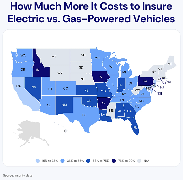 - Cost difference of insuring an EV vs. a gas-powered car: 76%