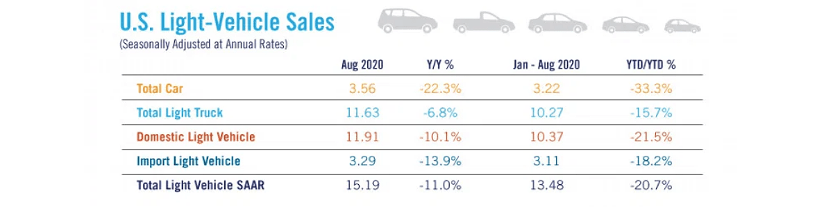 And through eight months of 2020, new light-vehicle sales were off by 20.7 percent compared with the same period in 2019. Raw sales volume in August 2020 totaled 1.33 million units, representing a decline of 19.1 percent from August 2019.
