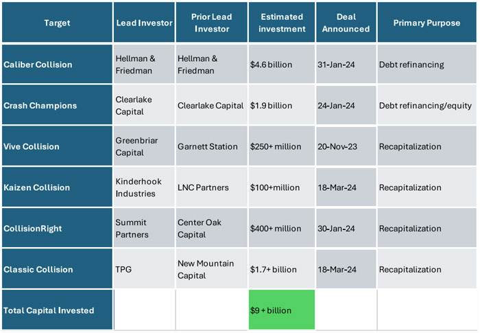In the last five months, more than $9 billion in capital has been invested into the collision repair industry — the largest amount was $4.6 billion in debt by Caliber Collision
