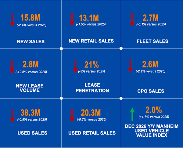 Cox Automotive’s 2026 outlook calls for a slowing but stable U.S. auto market, with most sales metrics expected to dip slightly from 2025 levels.