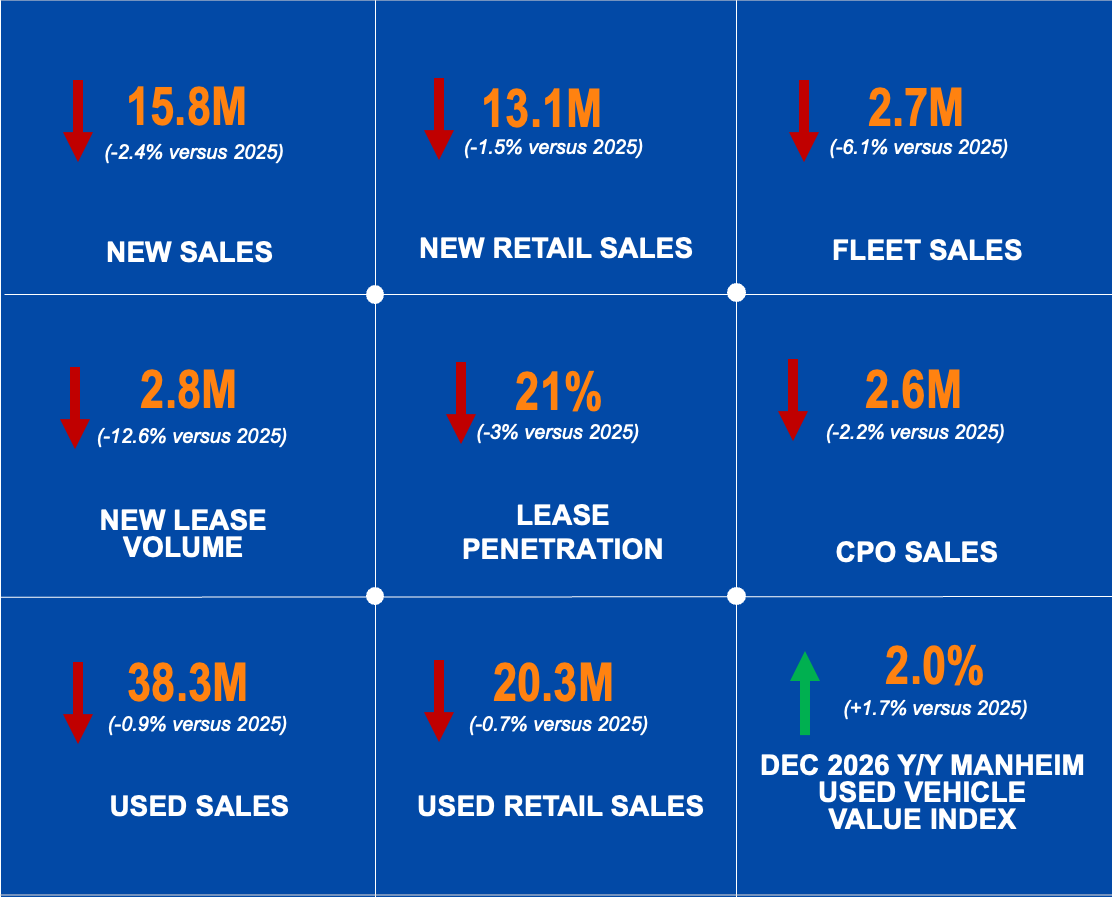 - Retail New-Vehicle Sales: The retail sales pace is expected to fall 1.5% year over year, and fleet sales are forecast to drop more sharply, down by 6.1% from 2025.