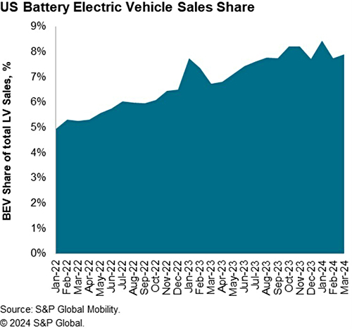 Continued development of battery-electric vehicle (BEV) sales remains an assumption in the longer term S&P Global Mobility light vehicle sales forecast. In the immediate term, some month-to-month volatility is anticipated. March BEV share is expected to reach 8%, similar to the month prior reading as automakers, dealers and consumers continue to digest the changes to IRA Federal tax credits to begin the new year. BEV share is expected to advance over the next several periods, pending the roll outs of vehicles such as the Chevrolet Equinox EV, Honda Prologue and Fiat 500e, all scheduled for market introductions over the first half of 2024.