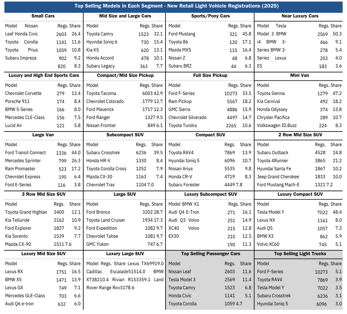 The table below shows the top five selling models in 2025 in 20 segments. In addition to unit registrations, it also shows each model’s market share in its respective segment.
