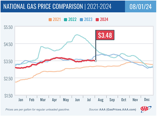 Drop comes as a tropical wave with storm-forming potential slowly approaches; AAA adds kilowatt-per-hour cost for L2 commercial charging by state.